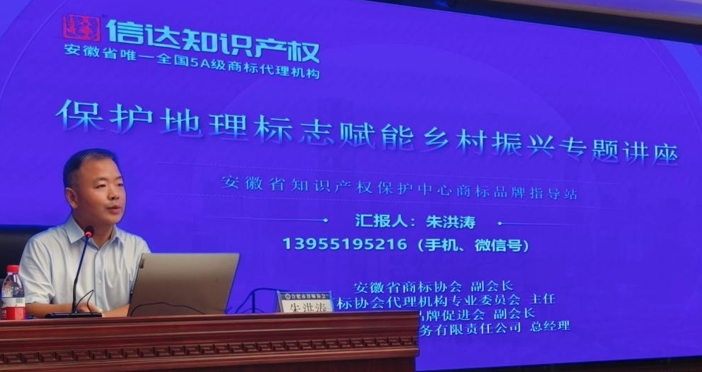 2024年8月24日下午,合肥市律师协会在安徽国际金融中心举办了“乡村振兴法律专业培训之知识产权篇”活动。活动邀请了安徽省商标协会副会长、商标协会代理机构专业委员会主任,合肥市质量品牌促进会副会长,安徽省信达商标事务有限责任公司总经理朱洪涛进行了专题授课。
