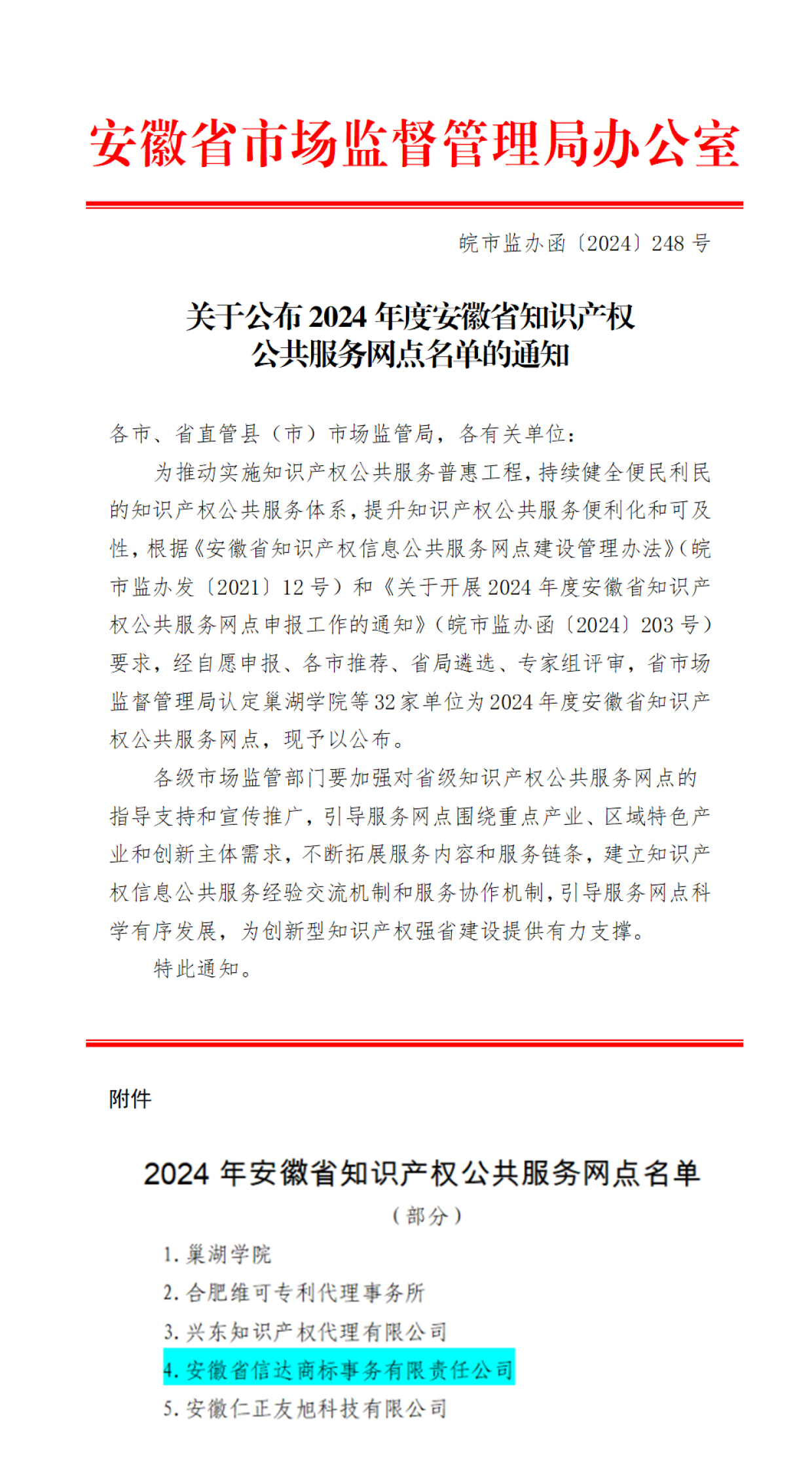 近日,安徽省市场监督管理局公布了“2024年度安徽省知识产权公共服务网点”名单,安徽省信达商标事务有限责任公司(以下简称“信达商标”)成功入选。