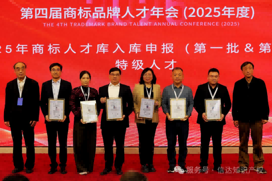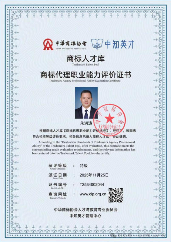 2025年11月23日,中华商标协会公布了2025商标人才库入库申报(第二批)的评价结果。安徽省信达商标事务有限责任公司董事长朱洪涛成功获评“特级”人才,并作为商标品牌人才展示。11月28日,朱洪涛受邀参加在北京召开的第四届商标品牌人才年会,接受了中华商标协会副会长兼秘书长吴东平的颁奖。