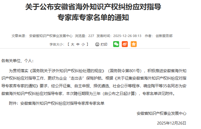 •   为贯彻落实《国务院关于涉外知识产权纠纷处理的规定》(国务院令第801号),积极推进安徽省海外知识产权纠纷应对指导工作,更好为企业“走出去”保驾护航,安徽省知识产权事业发展中心(以下简称中心)经公开征集、自主申报、择优遴选、社会公示等程序,确定35名同志为安徽省海外知识产权纠纷应对指导专家,安徽省信达商标事务有限责任公司副总经理周艳成功入选。