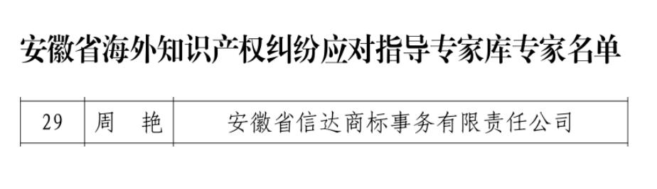 • 信达周艳入选安徽海外知识产权纠纷应对指导专家库专家